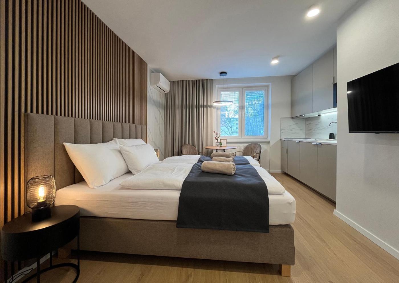 One-Bedroom Apartment. The air-conditioned apartment features 1 bedroom and 1 bathroom with a shower and a hairdryer. In the kitchen, guests will find a stovetop, a refrigerator, kitchenware and a microwave. This apartment has a minibar, flat-screen TV with streaming services, a quiet street view, as well as winechampagne for guests. The unit offers 2 beds.